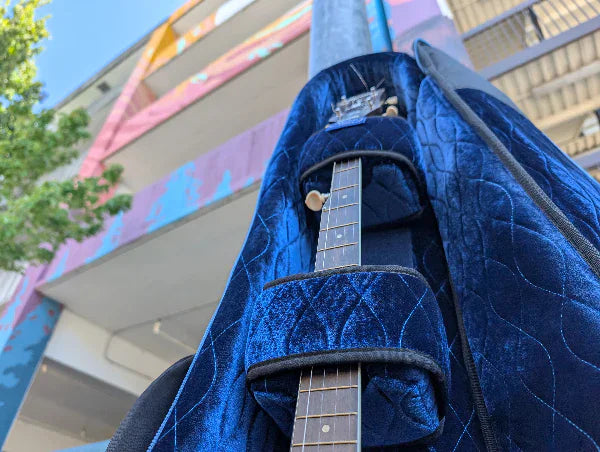 One the insides we have a beautiful blue interior that showcases a dual neck support that provides confidence on the road.  At the bottom extra cushion for those heavy banjos, if you got 'em. Either way, ease of mind is the outcome.
