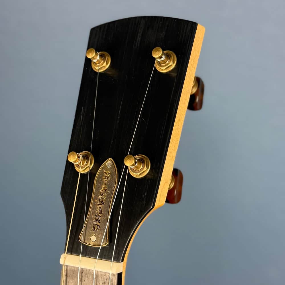 Banjo Studio is a big fan of Rickard Banjo. We love the details that go into making these fine instruments and it is a pleasure to offer you this wondering Rickard Dobson. The action is super low and an ease to play with it's short scale length. As a result the tone is warm and provides that plunky sound you crave. The neck is a hand polished varnish that feels so smooth to touch. If you look at the "S" scoop, you'll notice the partial frets inlayed into the ebony fretboard, such a nice touch to this instrument that showcases all the attention to details. As you expect, its a wonderful instrument to hear.