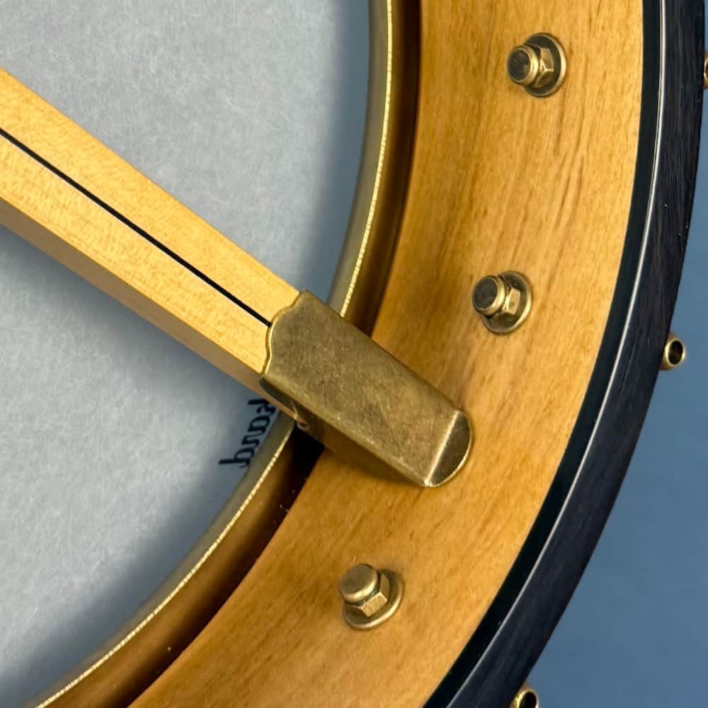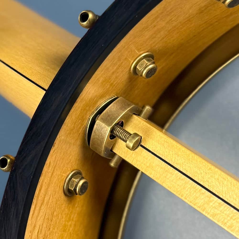 The Rickard Dobson banjo features a maple neck, 1/2 inch thick maple rim with rim cap and faux tortoise binding, Antiqued Brass Hardware including Dobson Tone Ring and their patented 10:1 Ratio Cyclone Tuners, 25.5" scale ebony fretboard, dots with star inlay, frailing scoop, EVO Gold Fretwire, choice of Remo Renaissance or Fiberskyn head.