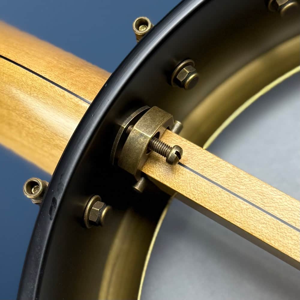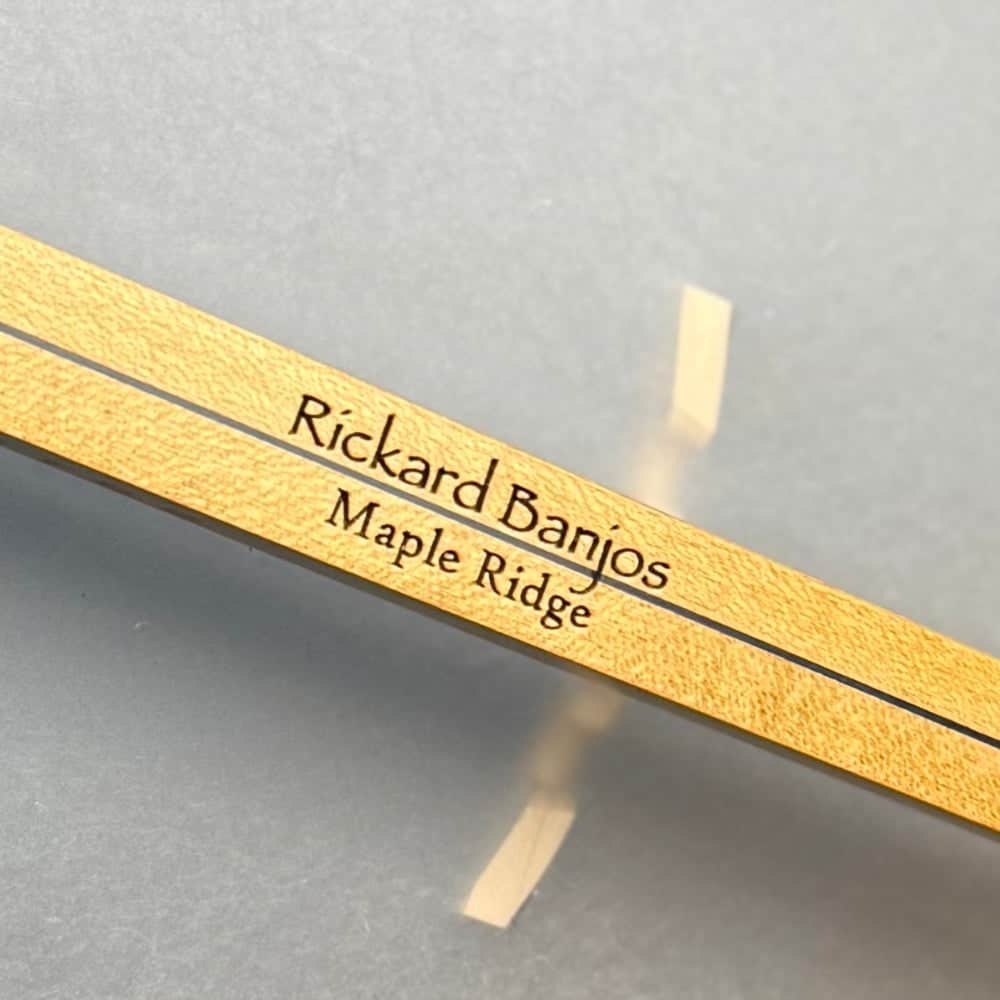 The Rickard Maple Ridge model features a three piece laminate maple neck with two way adjustable truss rod, 12 inch diameter 3/8 inch thick maple rim, Dobson Tone Ring, ebony fretboard, dots with star inlay, "S" frailing scoop, antiqued brass hardware, and Renaissance head.