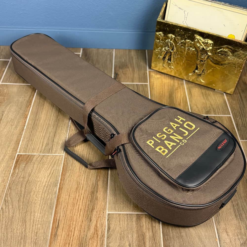 This is a gorgeous curly maple Pisgah banjo that features a Dobson tone ring, 12" maple rim, maple neck, and scooped fingerboard with an S shape and aged brass hardware.