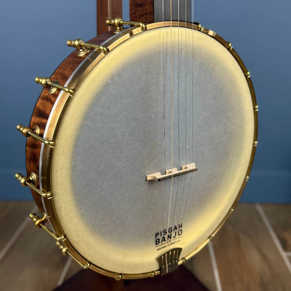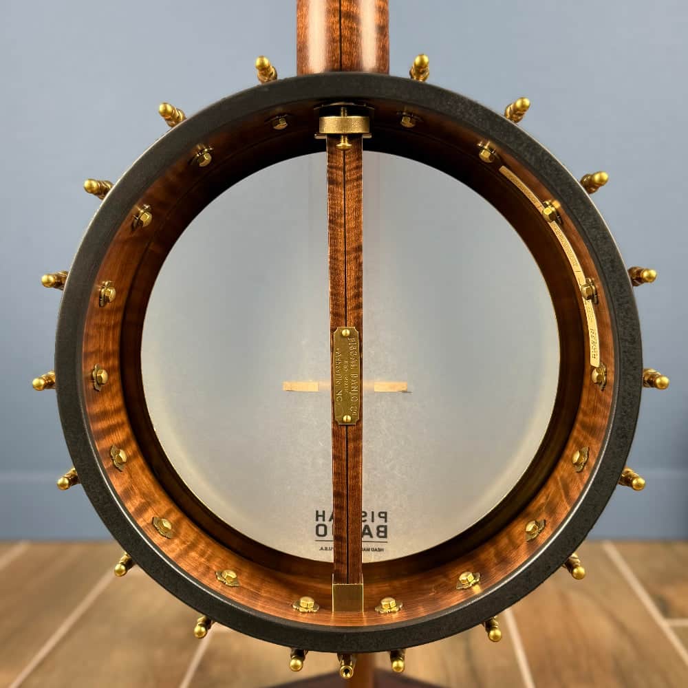 This Pisgah Dobson Pro also features the magnetic truss rod cover for easy access to the adjustable truss rod in the neck. It also has the familiar frailing notch at the top of the tension hoop.