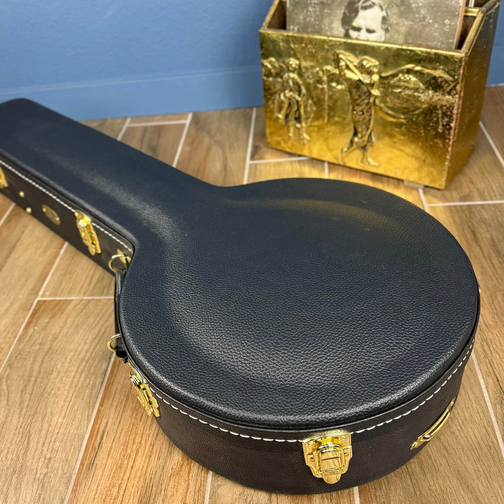 Sullivan Banjos is a company with a long history in the banjo business and have refined their craft into the Vintage 35.  This one is made with beautiful curated mahogany for the rim and neck.  This has a very loud sound and plays sweet as butter.  There is a ton of details put into this banjo including popular wood on the inside of the mahogany resonator that includes a tapered sidewall for extra projection.  It has the Sullivan Vintage 35 flathead tone ring installed on a 3-ply Red Maple Rim.  The tone ring is years of development that is based on a pre-war 1935 Gibson flathead. The inlays are cut from beautiful Mother of Pearl that just shines in the light.