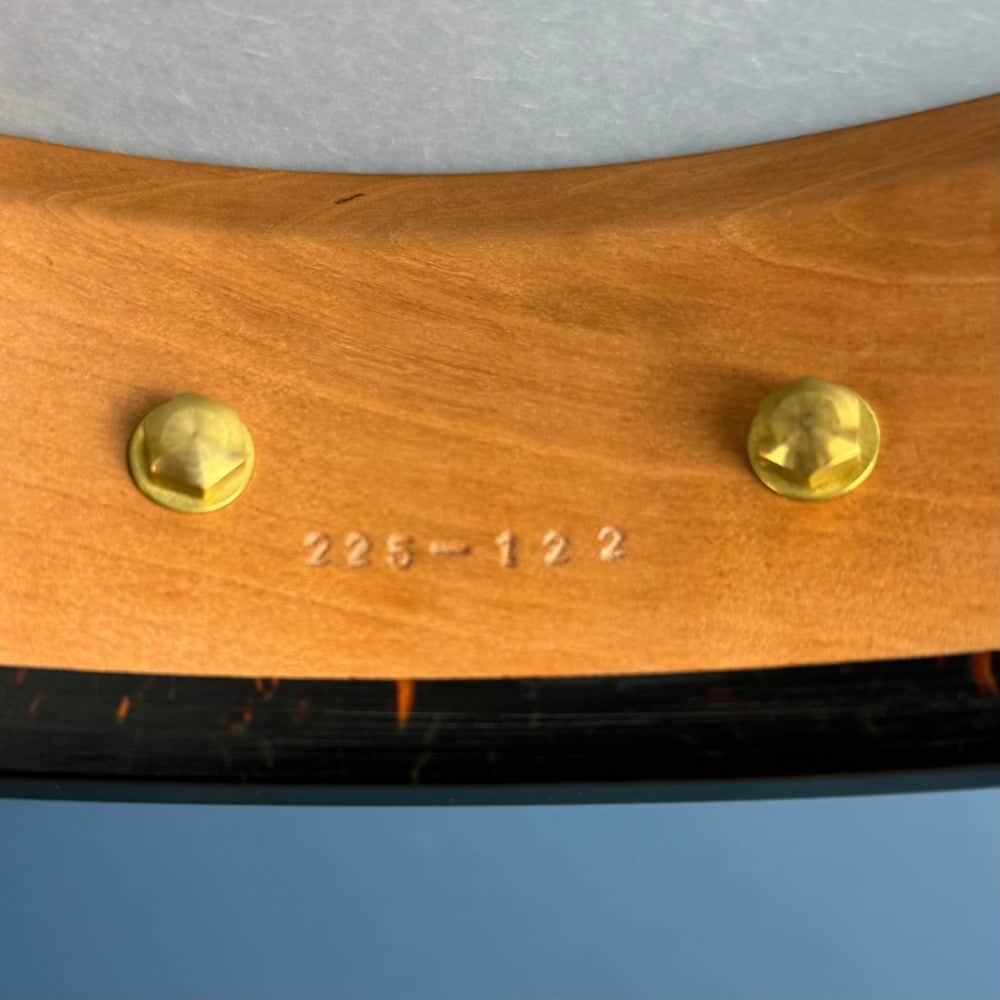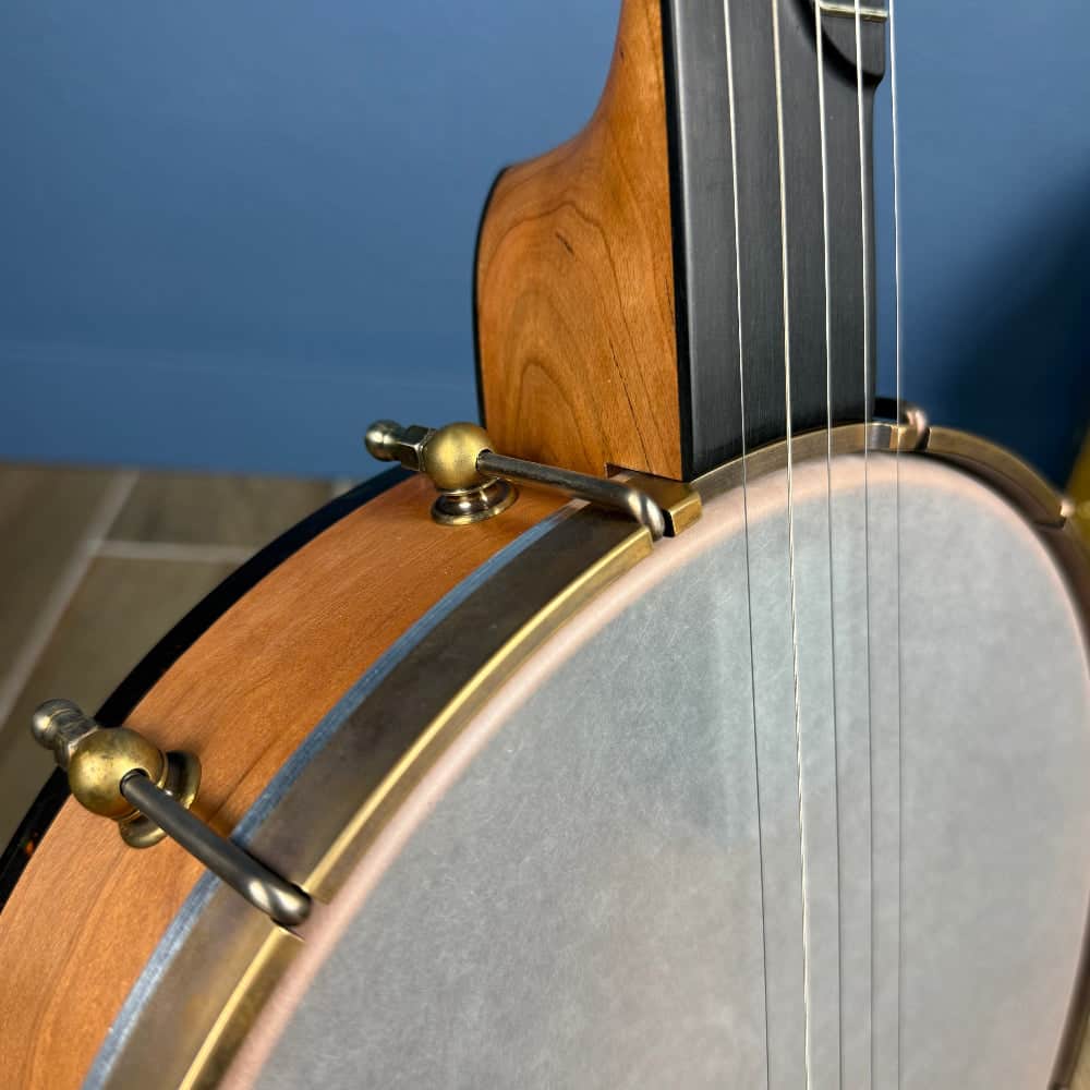 The headstock of this banjo showcases ebony buttons atop Rickard Cyclone tuners, embodying the Paddle shape. With a nut width of 1 11/32", it ensures a comfortable playing experience. The headstock design reflects classic elegance, seamlessly blending with the banjo's overall vintage look. Crafted from high-quality cherry, the neck features an ebony fingerboard with 17 hardened nickel frets and brass dot inlays. The tung oil finish enhances the natural beauty of the wood, while the brass dot position markers ensure easy navigation along the fretboard. The ebony capped heel adds a touch of refinement. The body of the Tupelo banjo is constructed with meticulous attention to detail. It includes 14 brackets and a custom 5/8" OME bridge for optimal stability and tone. The dowel stick ensures structural integrity. The cherry rim paired with a Renaissance head produces a rich, resonant sound that captures the essence of traditional banjo tones. Aged brass hardware, including the brass aged tension hoop and Sweetone tailpiece, further accentuates its vintage charm. The wooden armrest and tortoise shell binding add a touch of elegance, while the ebonite rim cap provides durability.